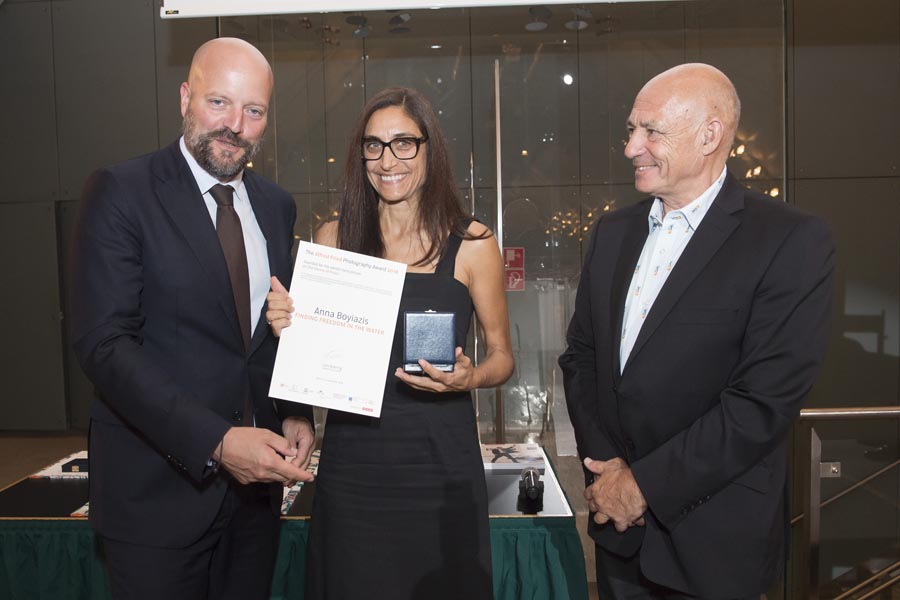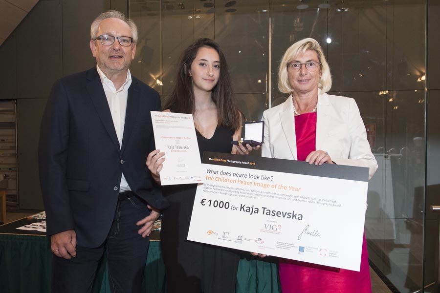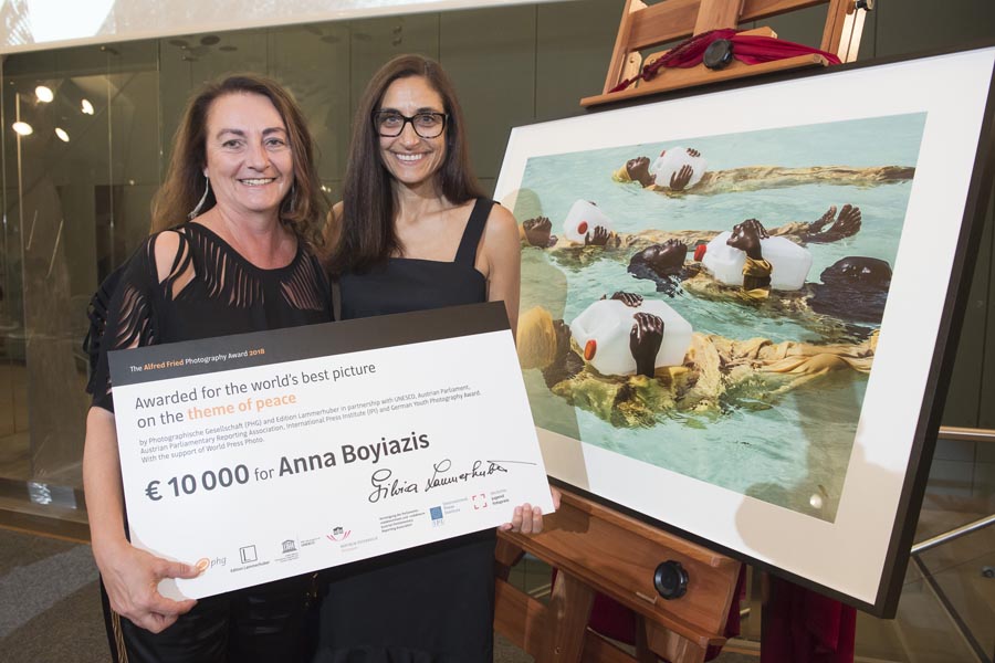 The Alfred Fried Photography Award 2018 was presented on 20 September 2018 at a gala in the rooms of the Austrian Parliament. The President of the Austrian National Council, Wolfgang Sobotka, introduced the ceremony attended by 200 guests. The main award, Peace Image of the Year 2018, named after the 1911 Nobel Peace Laureate, Austrian Alfred Hermann Fried, and worth 10 000 euros, went to California-born photojournalist Anna Boyiazis for her photo series about the Panje project: Girls on the island of Zanzibar, which is part of Tanzania and dominated by Islamic rules, claim the right to disregard the ban on women swimming. The special award for the Best Single Picture, worth 1 000 euros, went to Canadian photojournalist, author and animal rights activist Jo-Anne McArthur for a photograph of the rescue of an orphaned gorilla in Cameroon. With an image of peace, understood as a state of rest in comfort and safety, 14-year-old Kaja Tasevska from Skopje, Macedonia, won the Best Children Peace Image of the Year, also worth 1 000 euros. Patron of the Young People Category is human rights activist Waris Dirie.
