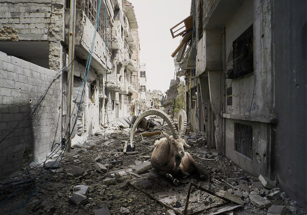 This serie is first of all a personal need of expression, towards the recent events evolving in the middle-east, in this project regarding the protests and the ongoing civil war in Syria. In every image a wild animal is put into a warzone, in the places affected by bombardments and by prolonged fighting. The presence of the animal wants here to represent the healing of these places.