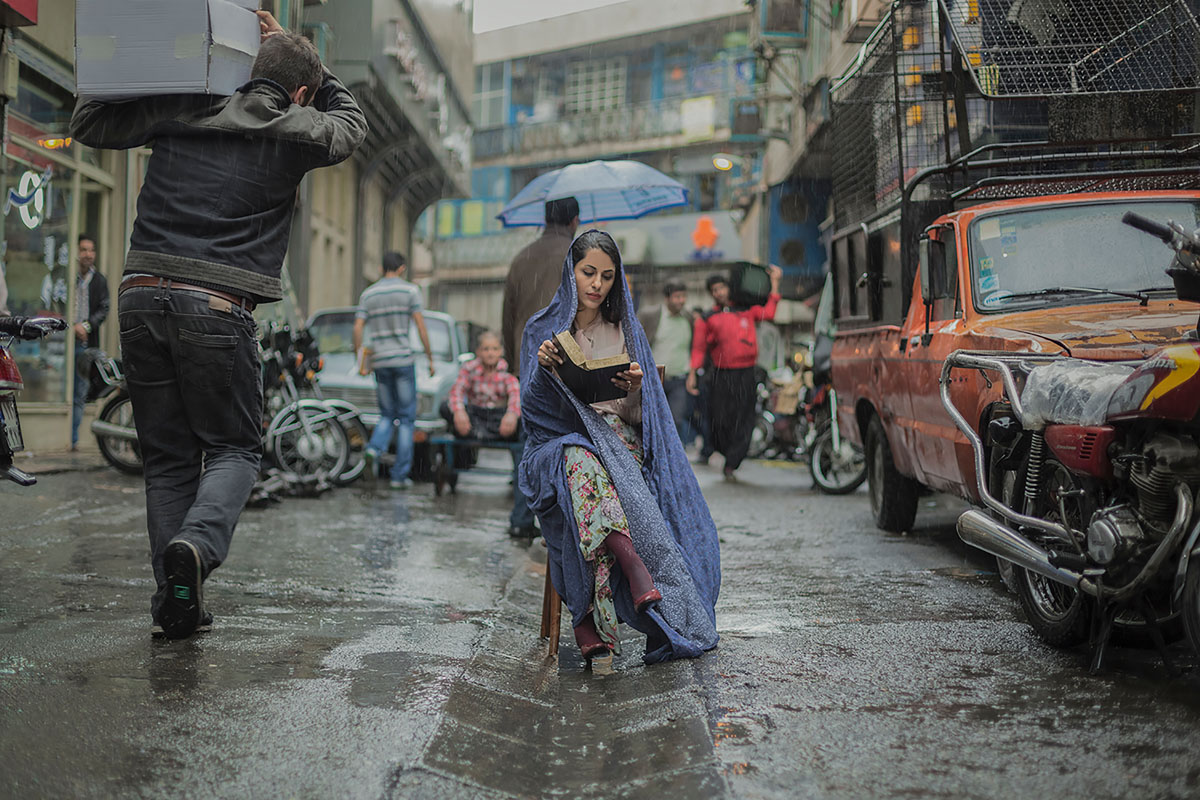 Maryam Firuzi, Iran: Reading for Tehran streets The street, says Iranian filmmaker and photographer Maryam Firuzi, quoting the Roman architect Vitruvius, could be the site of tragedy, comedy and satire. For her, the streets of her home town of Tehran are more a site of turmoil and sadness. In contrast, the walls of her flat provide a protective space for her imaginings and dreams. And yet, Firuzi has taken to the streets, turned a folding chair into a throne and women into an unassailable, self-absorbed queens. Staged, of course. A fairy tale. Women with a book in their hands. Reading! If people would read more, Firuzi claims, if they read mostly poems, the world would be a more peaceful, a better place. Because reading would make you more tolerant, create empathy with others, understanding for a life other than your own. Maryam Firuzi, born in Shiraz, Iran, in 1986, turned early to literature and painting, later to Persian calligraphy. She has a Diploma in Mathematics, a Bachelor in Software Engineering. She studied at the Art School in Tehran, finishing with a Master in Cinema and Film Studies. In one of her films she explored the impact of Ginsberg’s poems on young people in Iran during the Islamic Revolution. She is particularly interested in freedom and the voices of women in society. The struggle for the right of women to move about freely. A typical photograph is that of 24-year-old actress Mahsa at the Persian Gulf. It shows the young woman without hijab, and Firuzi says, “It’s like being born again.” (Text by Peter-Matthias Gaede)
