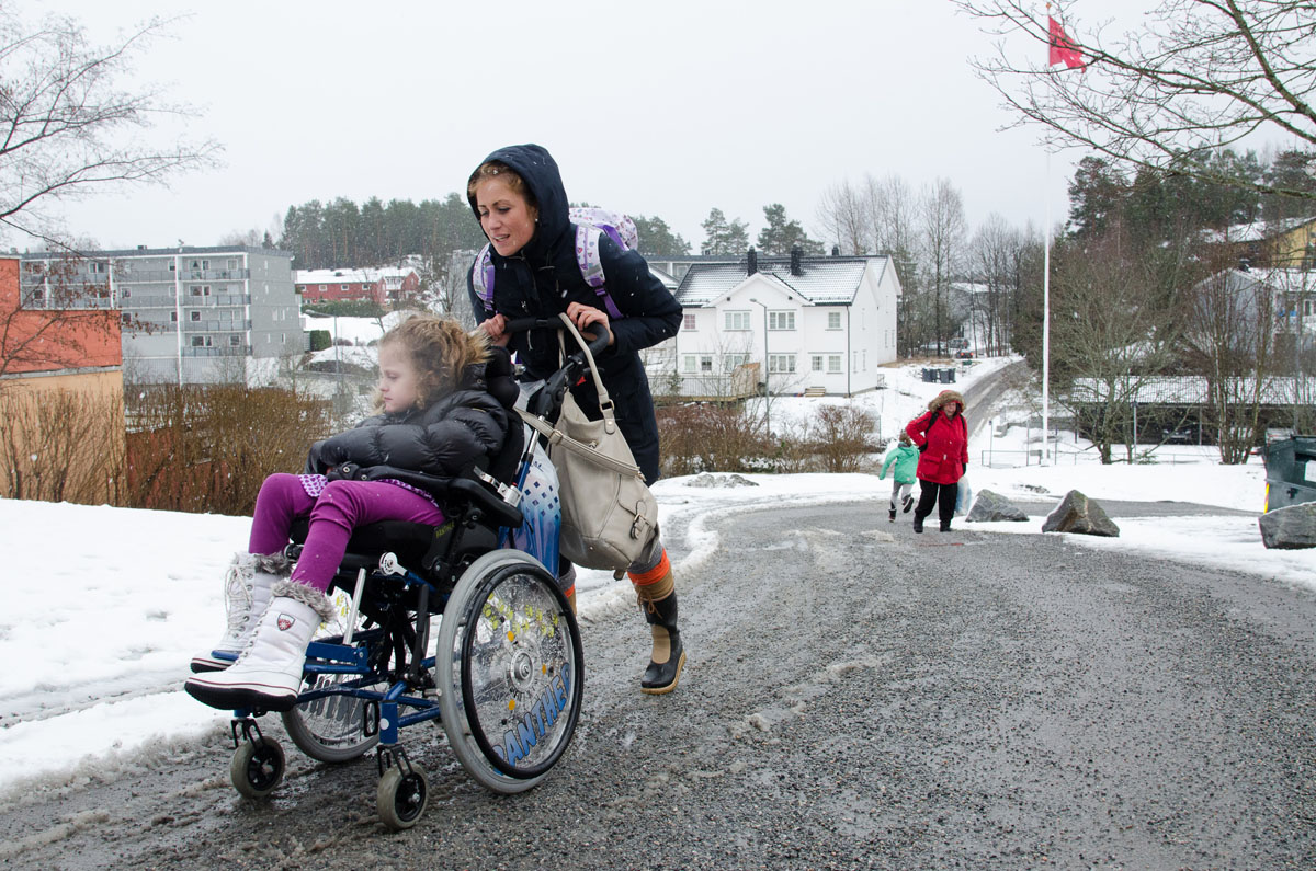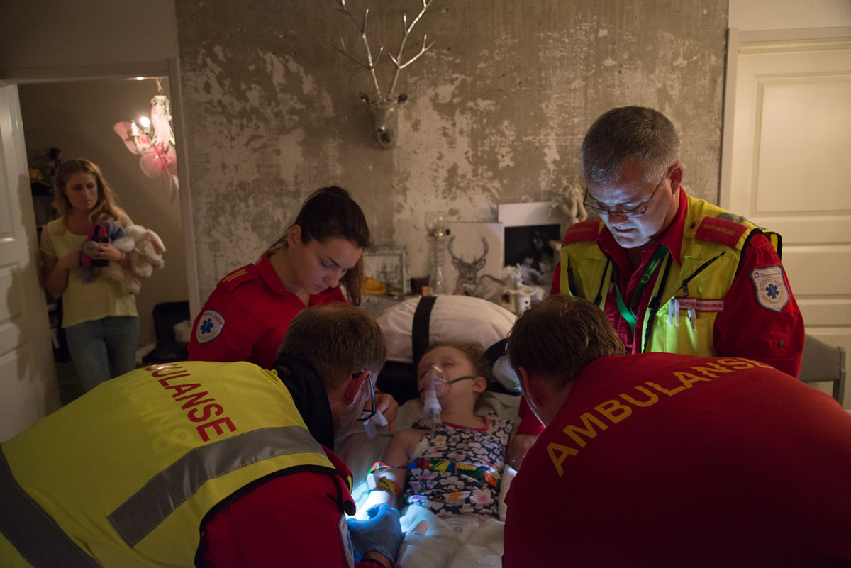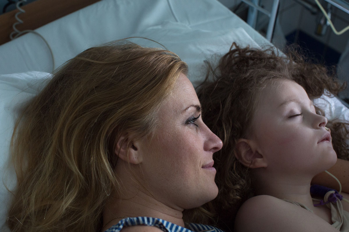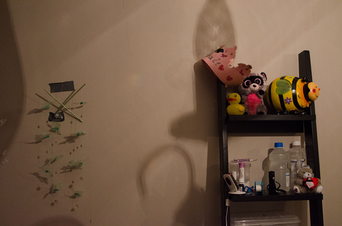 The light penetrates the room, giving the floor highlighted patterns from the curtains. In the corner, a red light is blinking, and numbers indicating body activity. Just opposite there is a big teddy bear and a princess crown. Eva Natali lives just outside Oslo, in Holmlia, together with her mother June. In the nights Eva needs to be monitored, in case of a seizure attack. She suffers from a rare genetic defect called Grin 1, and heavy epilepsy triggered by it. This photo-essay is about the bond, strength and love between mother and child. And how they show it to each other.