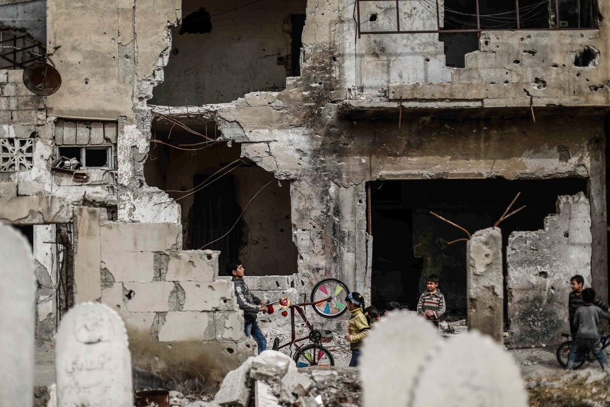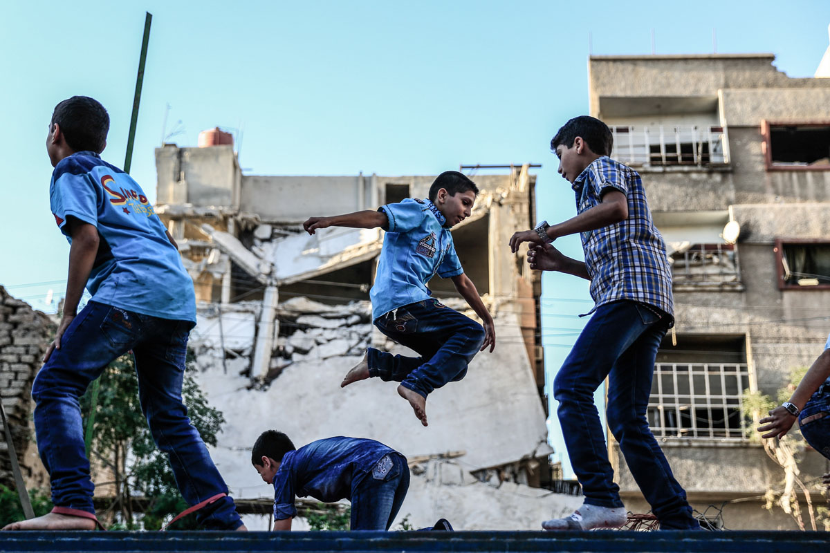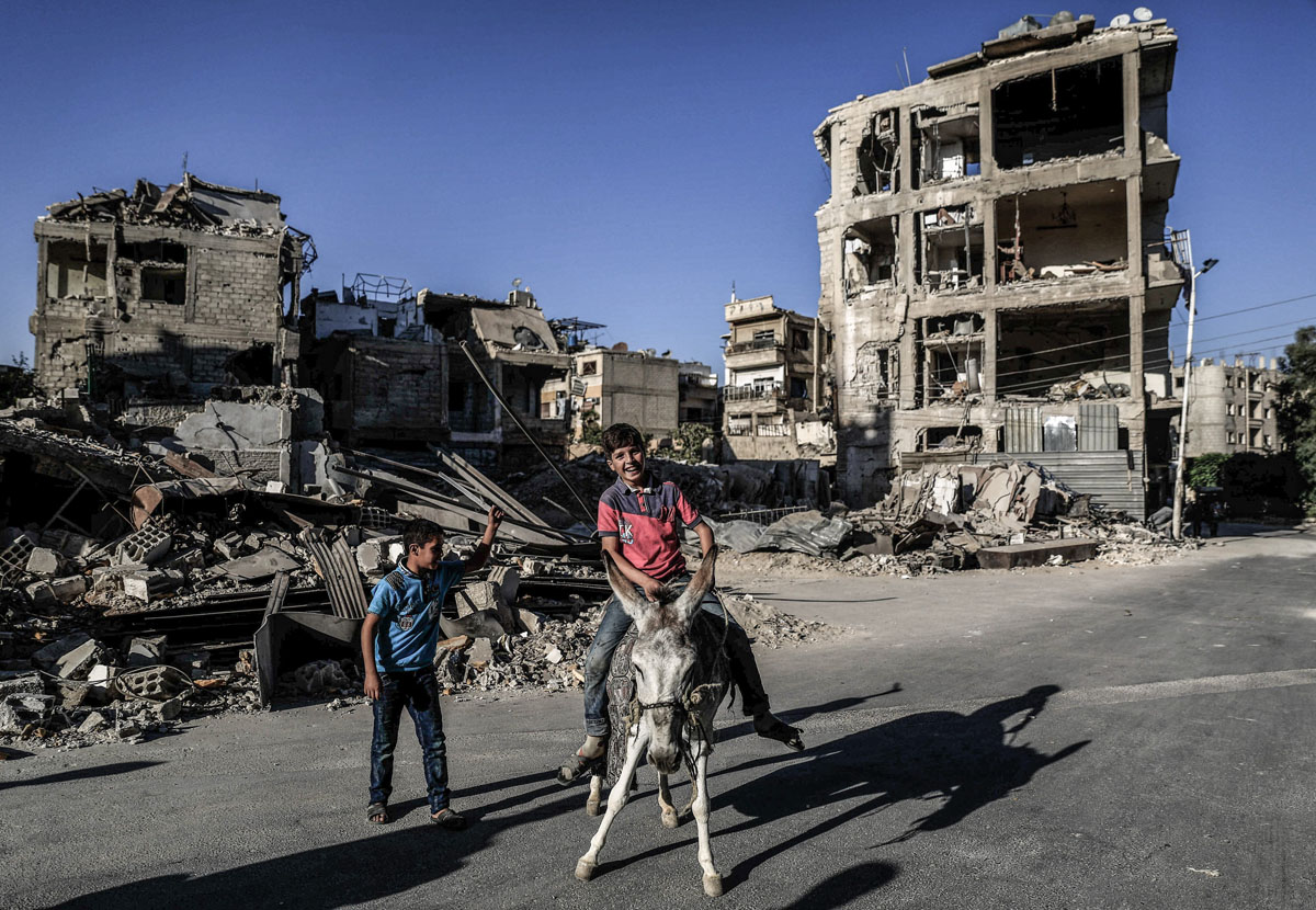 Peace could have different meanings depending on the geographical spot and its circumstances. In Syria's Eastern Ghouta, peace could be children playing on swings made of rockets that were sent to kill them, peace could be youth playing soccer at their destroyed school, peace could be children playing with their bikes, not caring about the warplanes and destruction around them, peace could be a man who still makes bread in his destroyed bakery, peace could be people who still going on despite all the tough circumstances around them. Sameer Al-Doumy / AFP