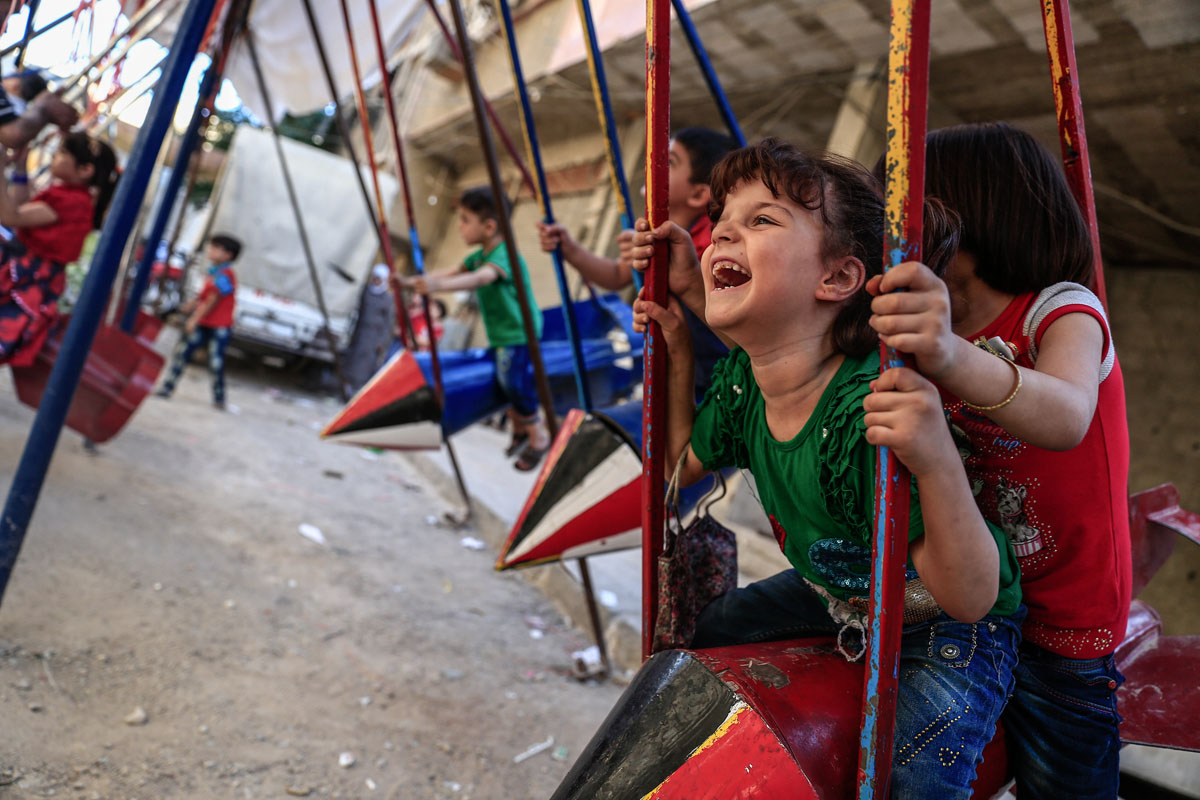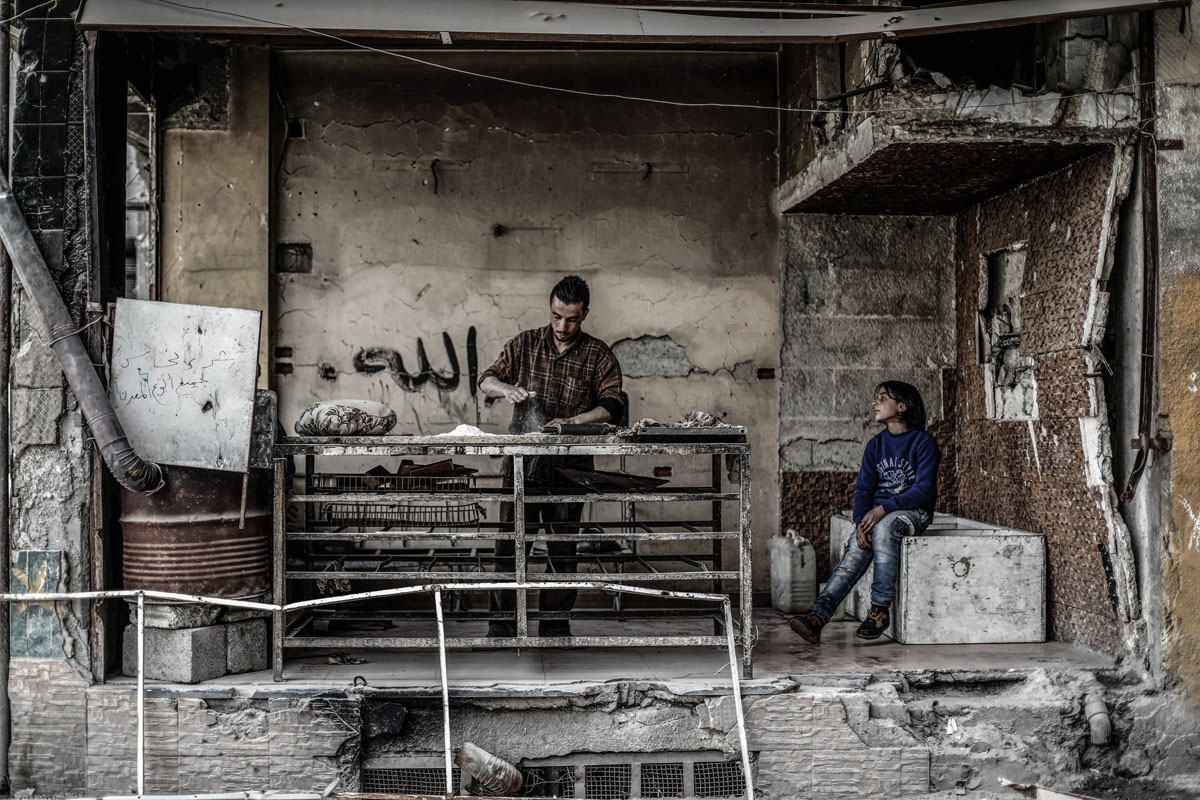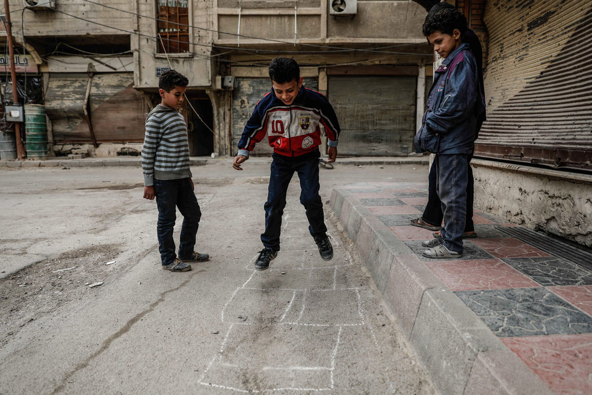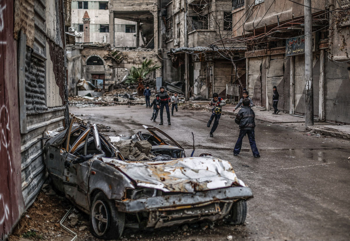 Peace could have different meanings depending on the geographical spot and its circumstances. In Syria's Eastern Ghouta, peace could be children playing on swings made of rockets that were sent to kill them, peace could be youth playing soccer at their destroyed school, peace could be children playing with their bikes, not caring about the warplanes and destruction around them, peace could be a man who still makes bread in his destroyed bakery, peace could be people who still going on despite all the tough circumstances around them. Sameer Al-Doumy / AFP