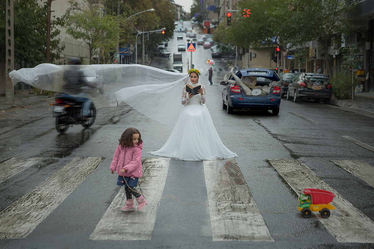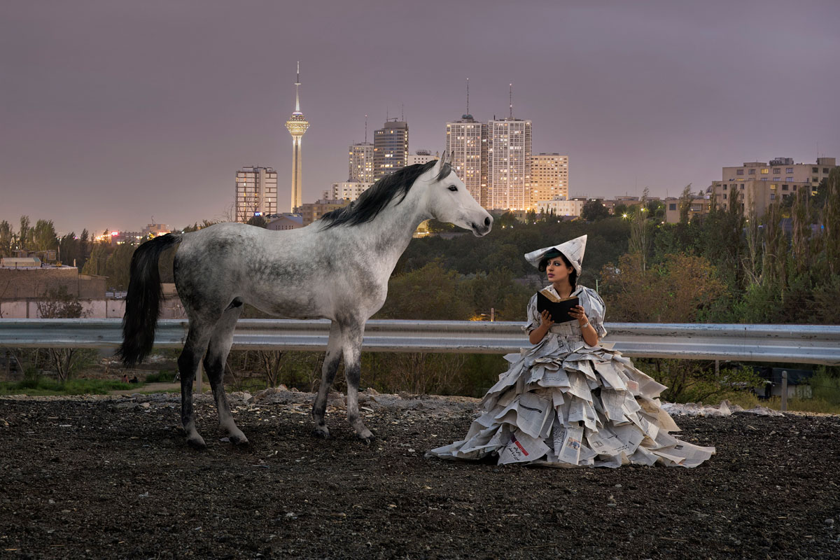 Maryam Firuzi, Iran: Reading for Tehran streets The street, says Iranian filmmaker and photographer Maryam Firuzi, quoting the Roman architect Vitruvius, could be the site of tragedy, comedy and satire. For her, the streets of her home town of Tehran are more a site of turmoil and sadness. In contrast, the walls of her flat provide a protective space for her imaginings and dreams. And yet, Firuzi has taken to the streets, turned a folding chair into a throne and women into an unassailable, self-absorbed queens. Staged, of course. A fairy tale. Women with a book in their hands. Reading! If people would read more, Firuzi claims, if they read mostly poems, the world would be a more peaceful, a better place. Because reading would make you more tolerant, create empathy with others, understanding for a life other than your own. Maryam Firuzi, born in Shiraz, Iran, in 1986, turned early to literature and painting, later to Persian calligraphy. She has a Diploma in Mathematics, a Bachelor in Software Engineering. She studied at the Art School in Tehran, finishing with a Master in Cinema and Film Studies. In one of her films she explored the impact of Ginsberg’s poems on young people in Iran during the Islamic Revolution. She is particularly interested in freedom and the voices of women in society. The struggle for the right of women to move about freely. A typical photograph is that of 24-year-old actress Mahsa at the Persian Gulf. It shows the young woman without hijab, and Firuzi says, “It’s like being born again.” (Text by Peter-Matthias Gaede)