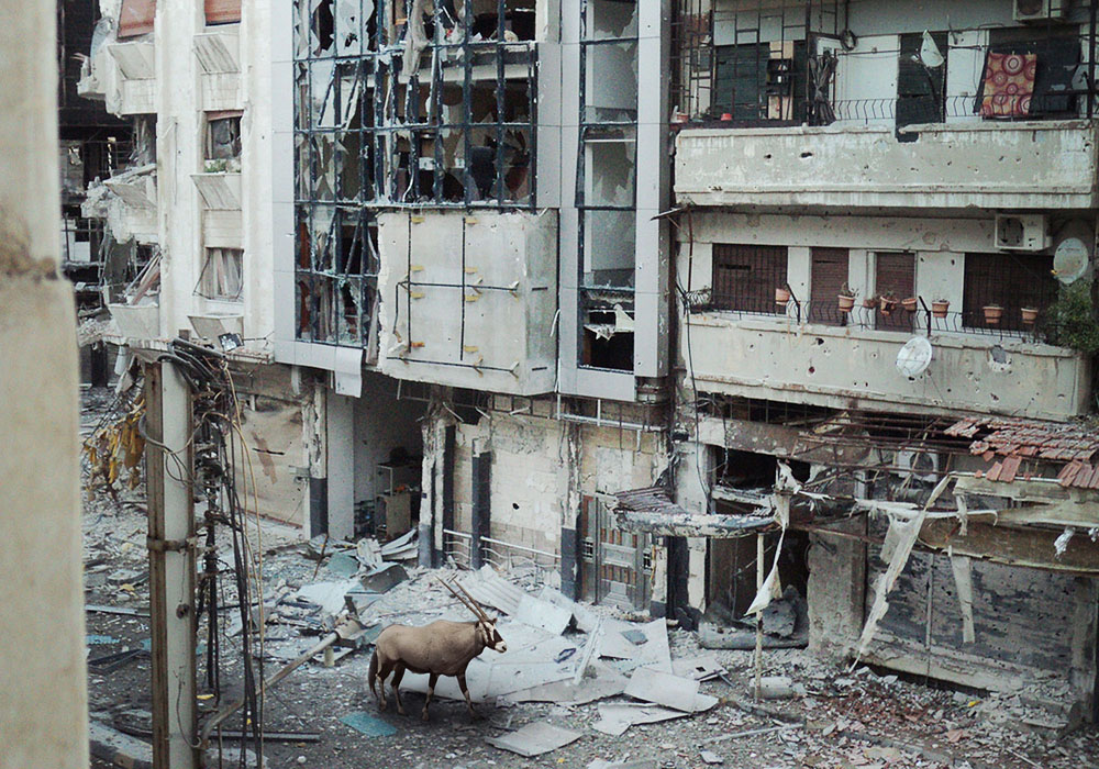This serie is first of all a personal need of expression, towards the recent events evolving in the middle-east, in this project regarding the protests and the ongoing civil war in Syria. In every image a wild animal is put into a warzone, in the places affected by bombardments and by prolonged fighting. The presence of the animal wants here to represent the healing of these places.