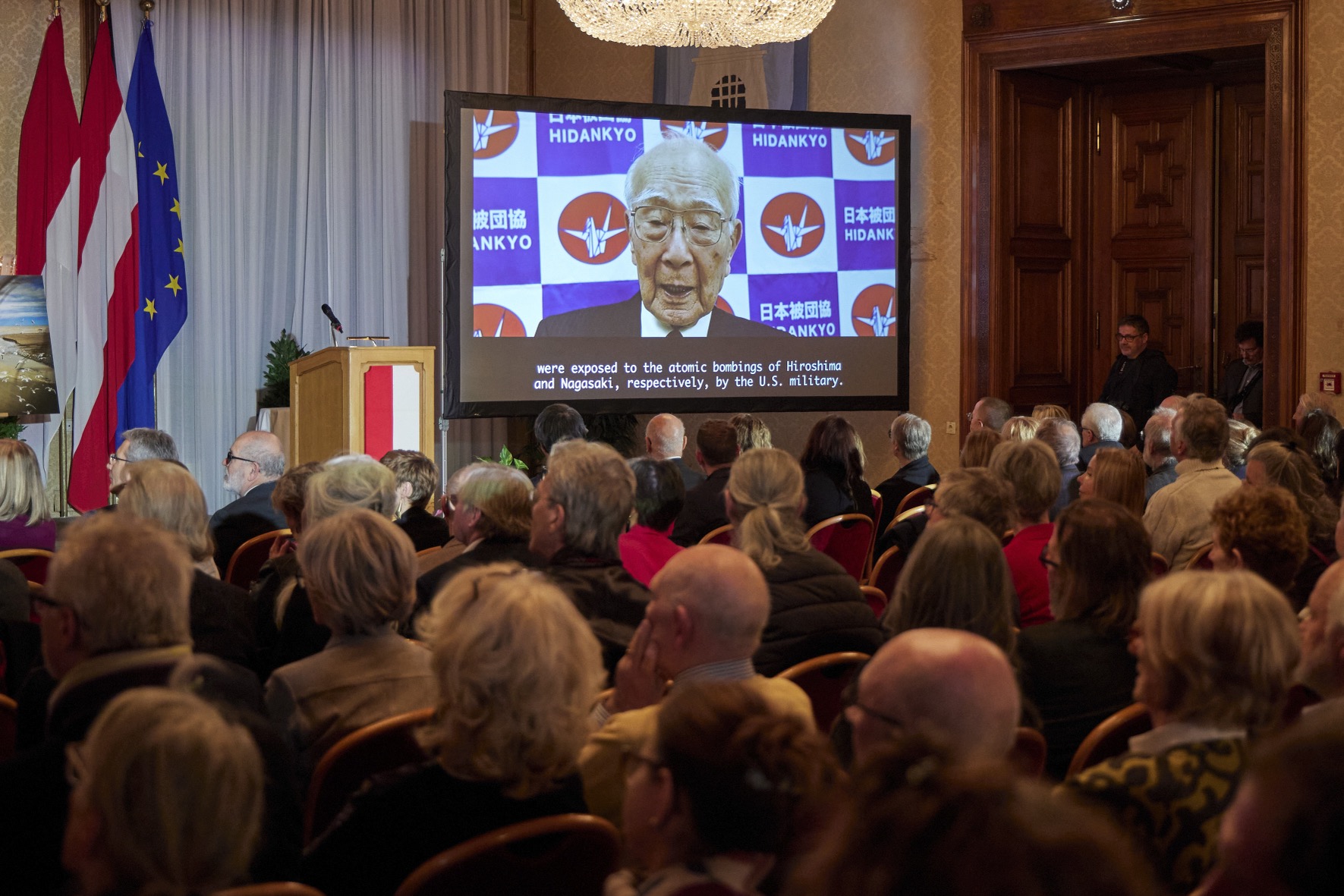 In the presence of the Japanese Ambassador to Austria, Iwama Kiminori, the keynote address of the evening was delivered by Terumi Tanaka, Secretary-General of Nihon Hidankyo, a Japanese peace organisation which was awarded the Nobel Peace Prize in 2024. Nihon Hidankyo was founded by survivors of the atomic bombings of Hiroshima and Nagasaki and campaigns for international nuclear disarmament.