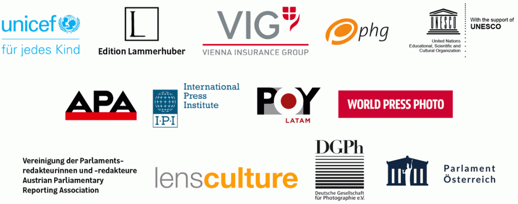 The Global Peace Photo Award is organised in cooperation with Edition Lammerhuber, the Photographic Society (PHG), UNESCO, the Austrian Parliament, the Association of Parliamentary Editors, the International Press Institute (IPI), the World Press Photo Foundation, POY LATAM, LensCulture, APA – Austria Press Agency, the German Photographic Society (DGPh), UNICEF Austria and the Vienna Insurance Group.