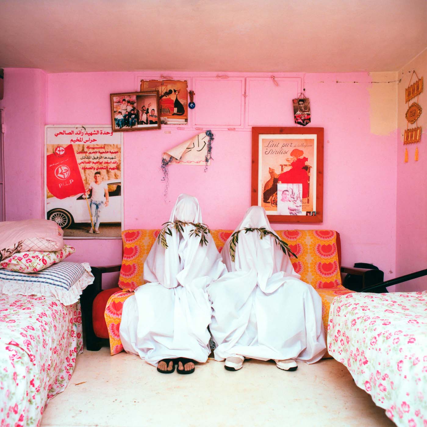 Love, a title of Peace. Aspired by the story of a Palestinian woman and an Israeli man, the picture shows two people, staged as peace doves, sitting in the living room of their house in West Bank. They first met in Jerusalem, at the house she was working as a maid, where they felt in love. He moved with her to the camp, but were only able to marry after his convertion to Islam. For long he was suspected to be an Israeli spy by the camp community. Nevertheless, they raised two boys. One day he left the house bound to Jerusalem, where he died. The son took his place on this photograph, sitting next to his mother.