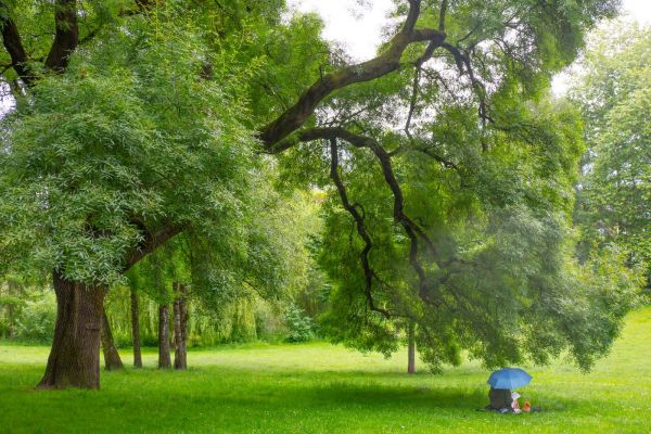 By looking at a wonderful big old tree it started to rain a bit and I noticed a lady with a dog sitting under a huge brunch reading a book. She didn‘t mind the rain and took out her blue umbrella.